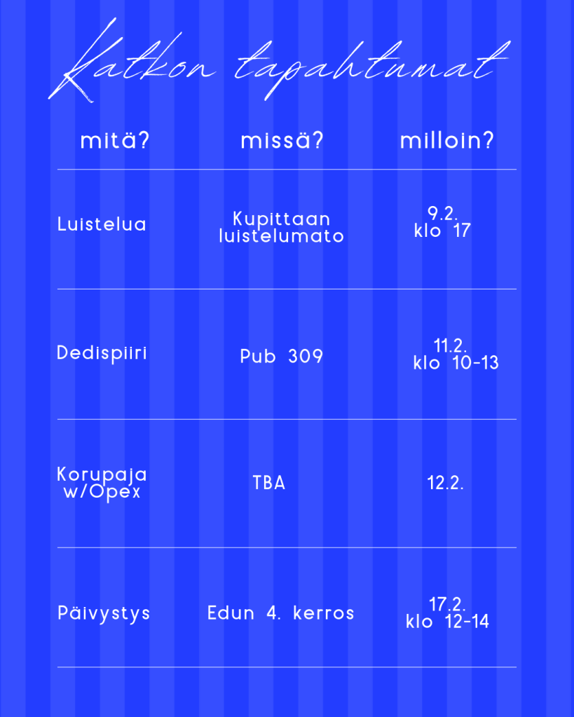 You can subscribe to this calendar by pressing the ”+ Google Kalenteri” button at the bottom right of the calendar or pressing here.