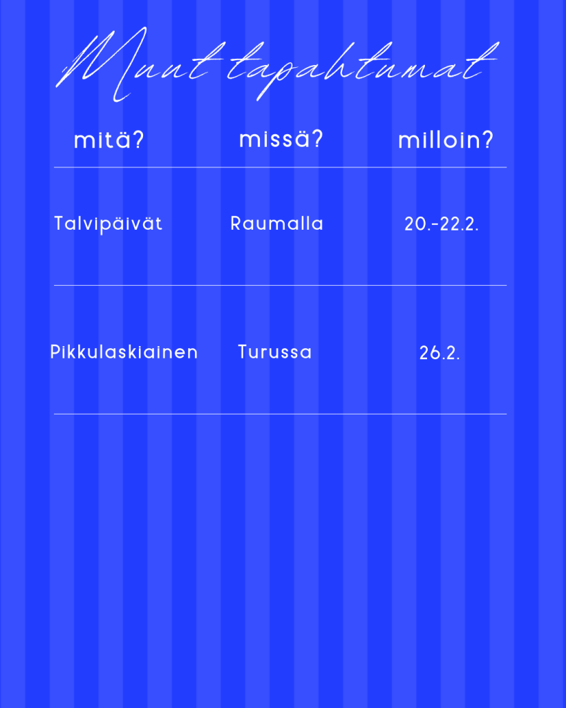 Voit tilata alla olevan kalenterin itsellesi painamalla ”+ Google kalenteri” -näppäintä kalenterin oikeasta alareunasta tai painamalla tästä.