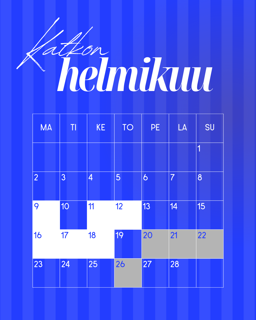 Voit tilata alla olevan kalenterin itsellesi painamalla ”+ Google kalenteri” -näppäintä kalenterin oikeasta alareunasta tai painamalla tästä.