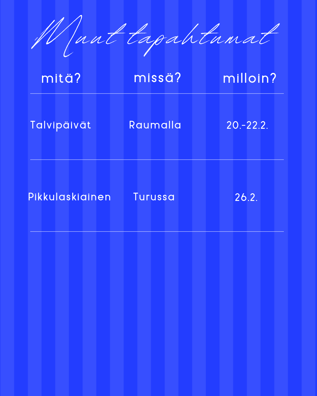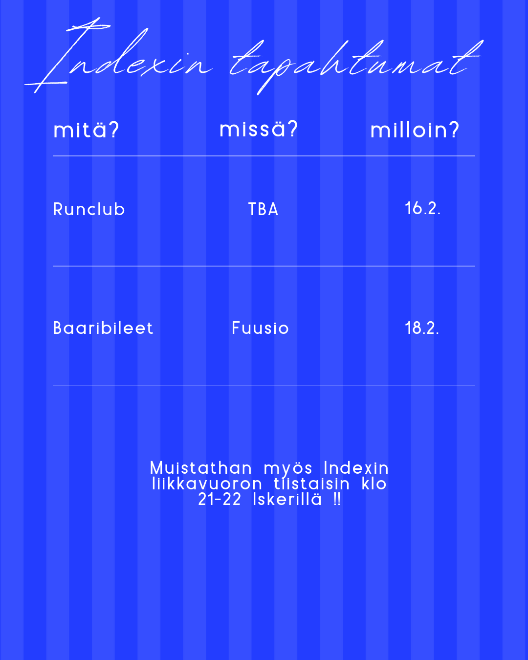 You can subscribe to this calendar by pressing the ”+ Google Kalenteri” button at the bottom right of the calendar or pressing here.